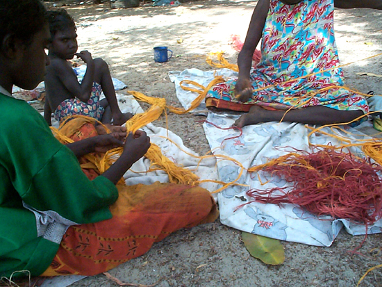 Here young women are being taught to separate the strands of balkpalk before being woven to make a skirt for a ceremony.